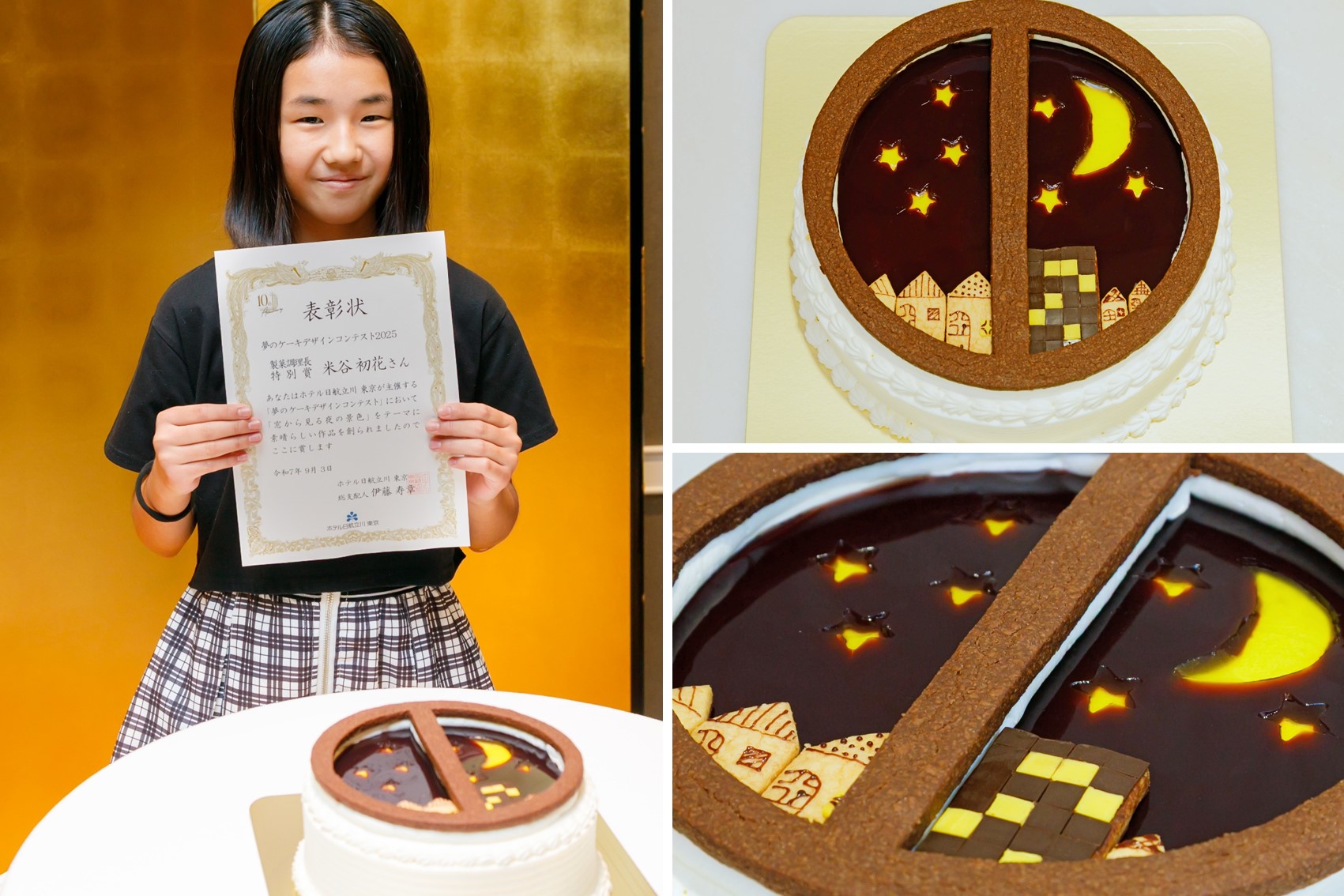 マスカットのショートケーキの上にクッキーで窓枠を乗せ、ブドウのゼリーとレモンのゼリーで夜空を、クッキーで街並みを再現しました。イラストのような青い色味は出せませんでしたが、相性のよいブドウとレモンのゼリーで、見た目だけでなく食べても美味しいケーキが出来上がりました。