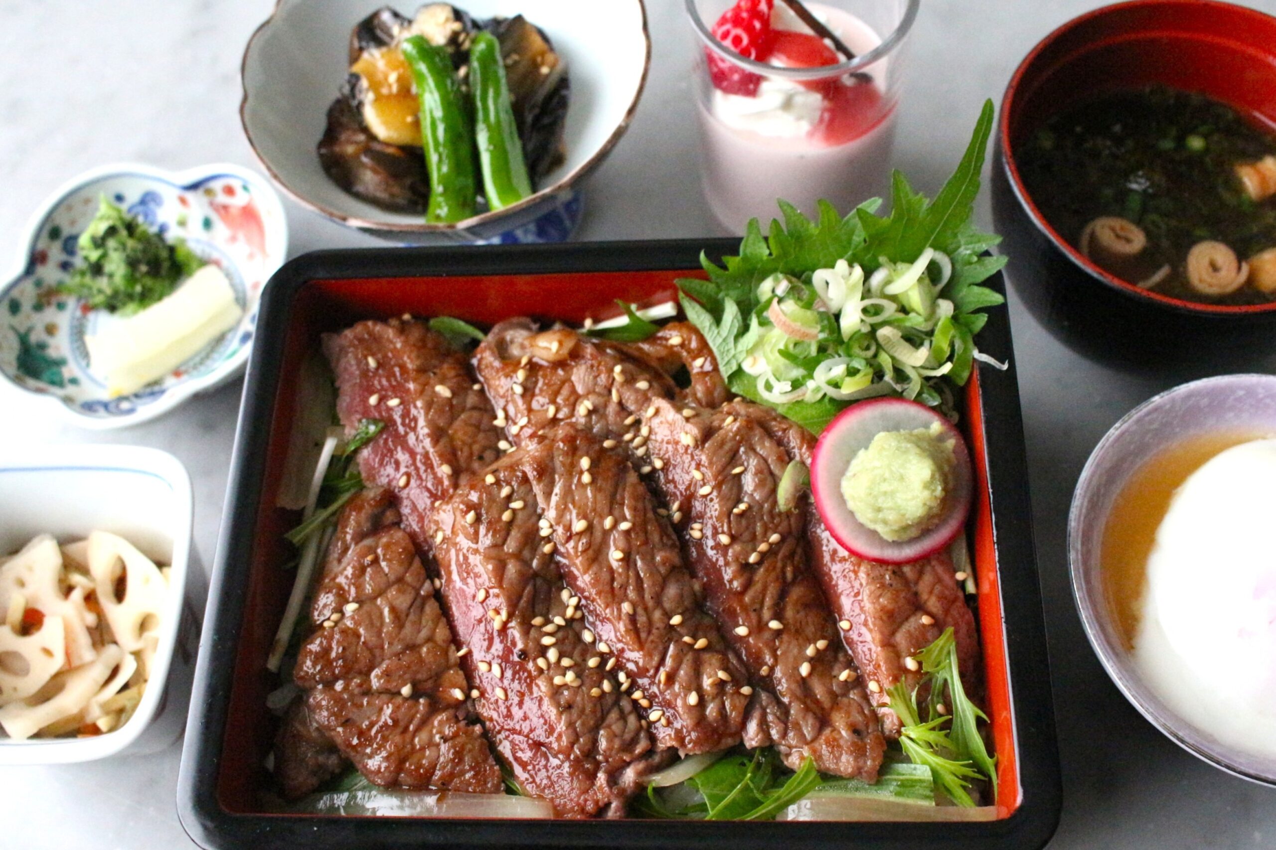 牛ステーキ重 玉葱 水菜 煎り胡麻 ニンニクチップ茄子田楽 青唐、温玉、香の物 味噌椀、プチデザート