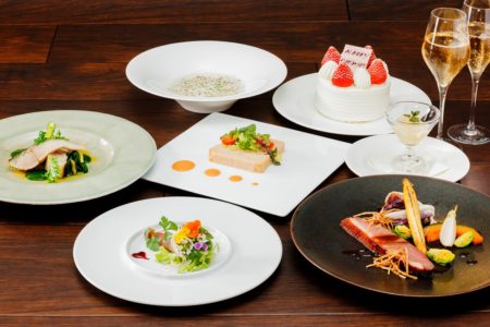 季節のコース料理にグラスシャンパン(お一人様1杯)と苺のショートケーキ(9.5cm/1組1つ)がセットになったプランです。