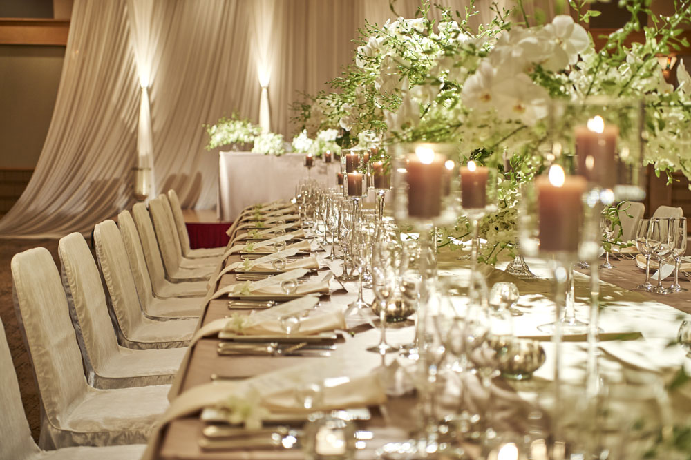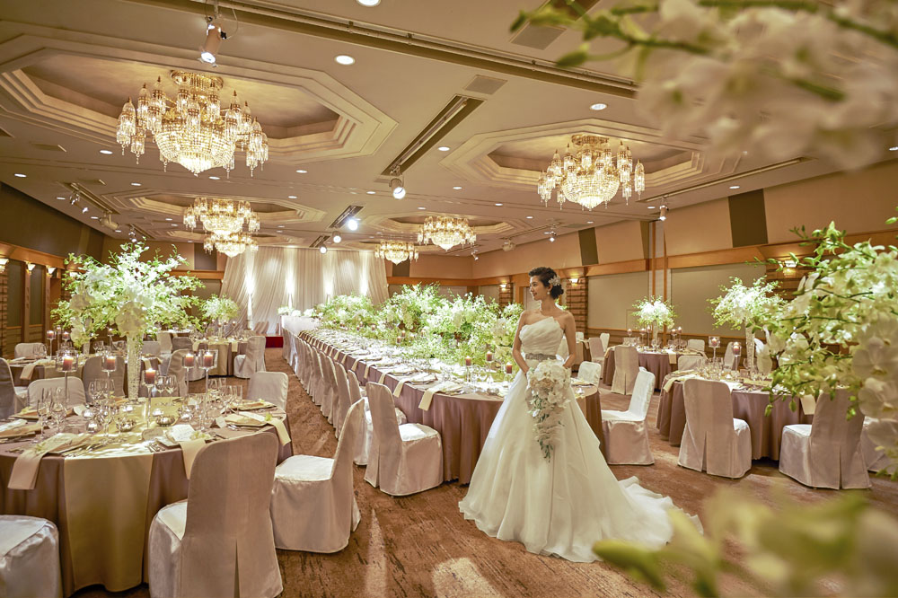 ホテル日航立川 東京最大のバンケットルーム「アトランティック」。 クリスタルカットビーズが無数に輝くシャンデリアが、気品あふれる上質な空間を演出します。