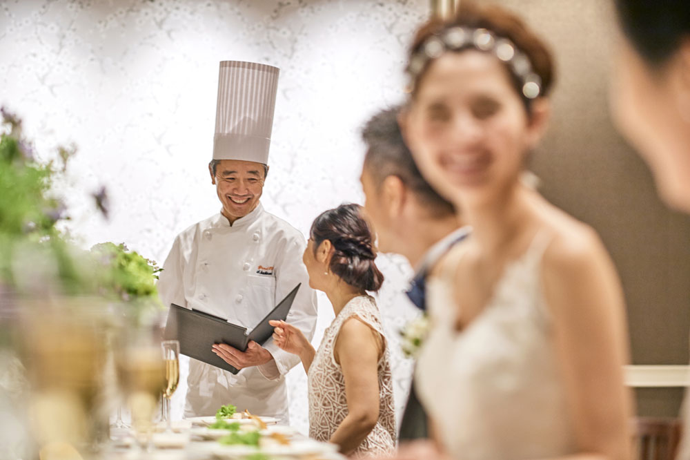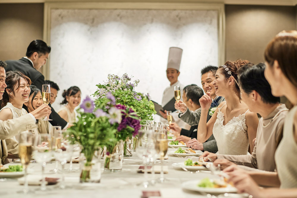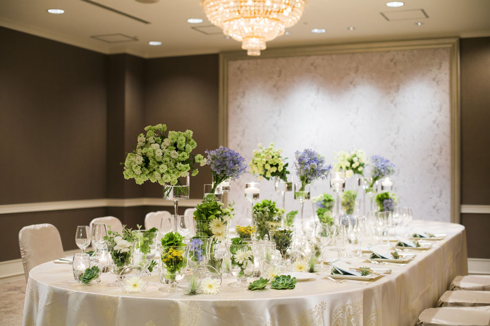 ホワイトシルバーの輝きを基調とした、優美なバンケットルーム「クリスタル」。 親しい方の祝福に包まれた、あたたかでアットホームなウエディングを引き立てます。