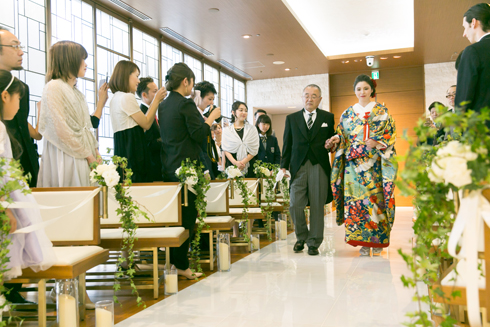 人前式だったこともあり、和装でも特に違和感はありませんでした。会場は光が差し込み明るく、ゲストとの距離が近いので暖かい雰囲気の中挙式をすることができました。