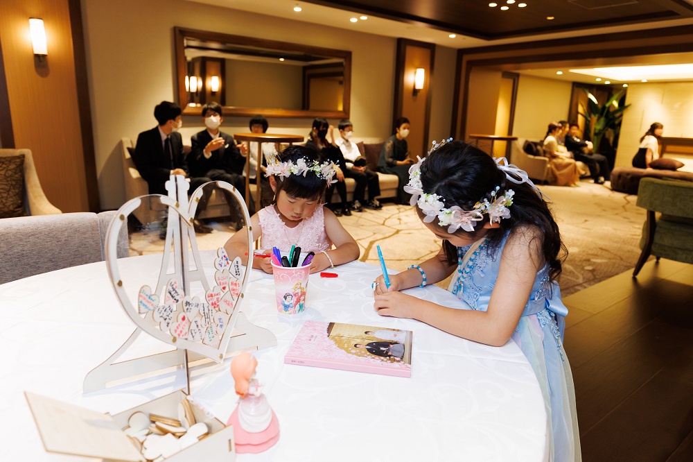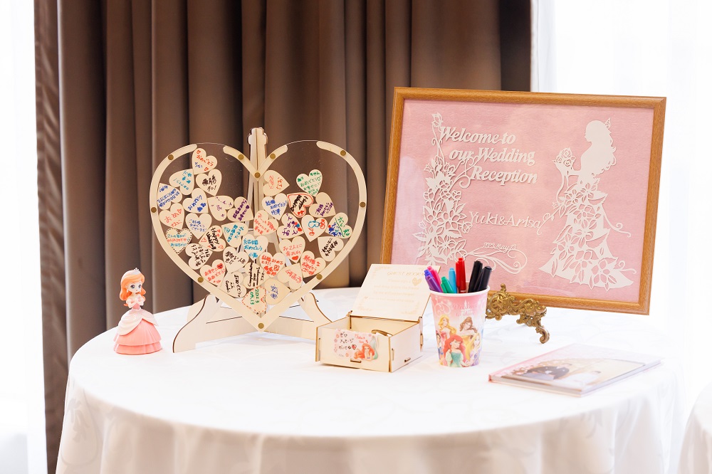 アリエルが大好きなこともあり 『アリエルの結婚式』をテーマに進めました。 会場のコーディネート・装飾・ペーパーアイテムなど テーマに合わせて決めました。 新郎がDIYが得意なこともあり 手作りのものもたくさん用意しました。 かしこまった式ではなく アットホームにしたかったので どうやったらみんながワクワク楽しんでくれるかを考え ゲスト同士で写真をたくさん撮れるような フォトスポット的なものも用意するなど 会場に入るまでや入ってからも 楽しんでもらえるように頑張りました。