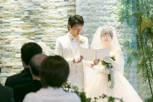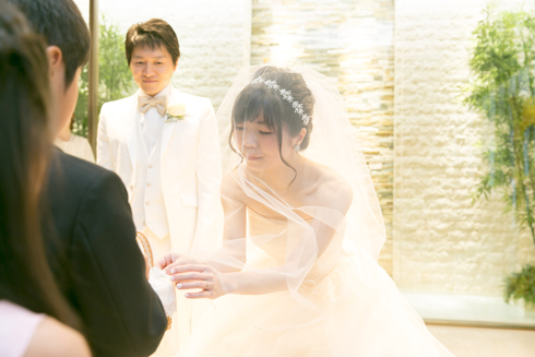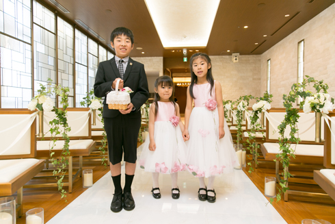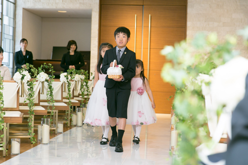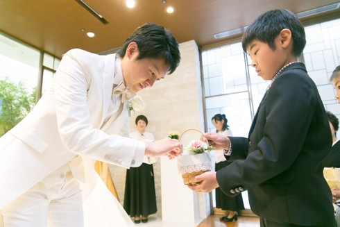予想以上に緊張しましたが、人前式で二人で考えた誓いの言葉を読み上げ、 私たち二人にしかできない挙式となりました。 親戚のお子さまにリングボーイ・リングガールをつとめていただいたのも、とても良い思い出です。